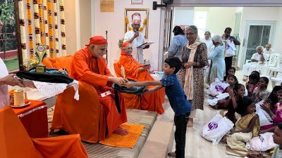 Swamiji and Ma appreciated the service of the 30 loving and caring voluntary teachers, and encouraged SIRD to grow further with Kalvi Maiyam. They had so much of joy seeing the children this time after one year. Ma had felt so moved by the children that she expressed her wish to give them dresses. Many devotees came forward to contribute, and just a day before the event, a team of volunteers went shopping and returned with thoughtfully selected dresses beautifully packed in boxes. On Nov 28, Poojya Swamiji presented each child a dress and dry-fruit prasada, while Ma gave each child chocolate prasada, offered by two of the overseas devotees.