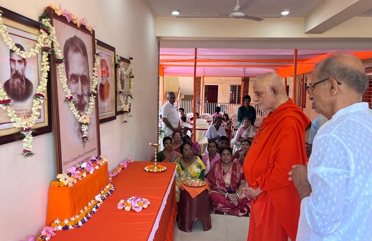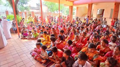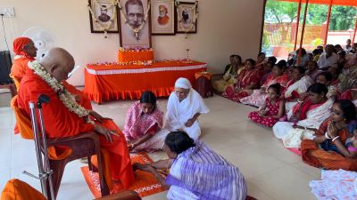 On 12th was the first pratyaksha pāda-pūjā of Poojya Swamiji and the devotees chosen to offer the worship – Smt Swapna Mukherjee and Sow. Amrita Chakraborty, had both received deeksha from Poojya Swamiji earlier this year. Poojya Swamiji then gave his Benedictory address in Bengali, explaining how transformational was his meeting with Baba. It had led Poojya Swamiji to an inner abundance which enables him to declare to this day “I am nothing, I want nothing, I have nothing”. Around 200 villagers attended the bhakti-bhoj that followed.