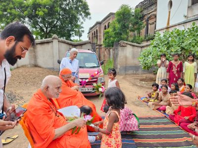 The penultimate day of Poojya Swamiji’s visit started with the distribution of dresses to around 320 children. Ashramites and devotees had worked alongside Poojya Swamiji and Ma till 1.30 am the previous night to sort out the correct sizes for age groups ranging from 6 months to 14 years each for girls as well as boys. By 2 pm over 320 children had received clothes along with Cadbury chocolate bars – our hearts were overflowing and our stock was exhausted!