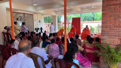 Almost immediately after the meeting, the concluding satsang started around 7 pm. Poojya Swamiji chanted select verses, showing how devotion aims to expand and elevate the devotee’s mind. When asked whether they liked listening to these talks and found it beneficial, the assembled devotees eagerly nodded with joyful smiles. After prasada distribution, everybody was offered bhakti-bhoj on the first-floor Annakshetra. Nearly 220 people were fed in batches.